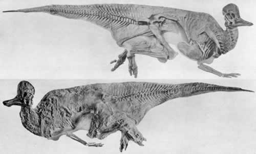 Mumie von Corythosaurus, teilweise mit Haut bedeckt. Vorderbeine sind in der oberen Abbildung zeichnerisch ergänzt.