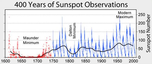 Anzahl der Sonnenflecken (aus Wikipedia) seit der Kaltzeit Maunder Minimum bis zum Jahr 2000. Nach 2000 ist die Anzahl der Sonnenflecken auf ein Minimum gesunken und soll jetzt wieder steigen.