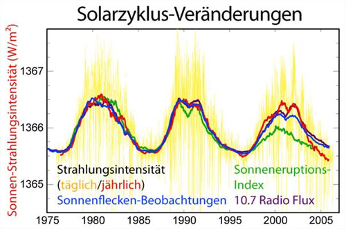 Sonnenzyklus seit 1975 bis 2005 mit abnehmender Strahlungsintensität und geringen Sonnenfleckenzahl seit 2000. Seit 2005, also außerhalb der grafischen Darstellung, war die Sonne bis 2009 weiterhin ohne Aktivität, mit einer am Minimum befindlichen Sonnenfleckenzahl. Der mittlere Sonnenfleckenzyklus von 11 Jahren wurde 2009 weit überschritten und könnte 2010 über die bisher maximal bekannte Zeitspanne hinaus andauern. Die Sonnenfleckenzahl ist nicht das Maß der Sonnenaktivität als solches, sondern nur ein Indikator für effektive Aktivität, die größer ist als Intensitätsschwankung im optischen Bereich (ausführlich in »Der Energie-Irrtum«).